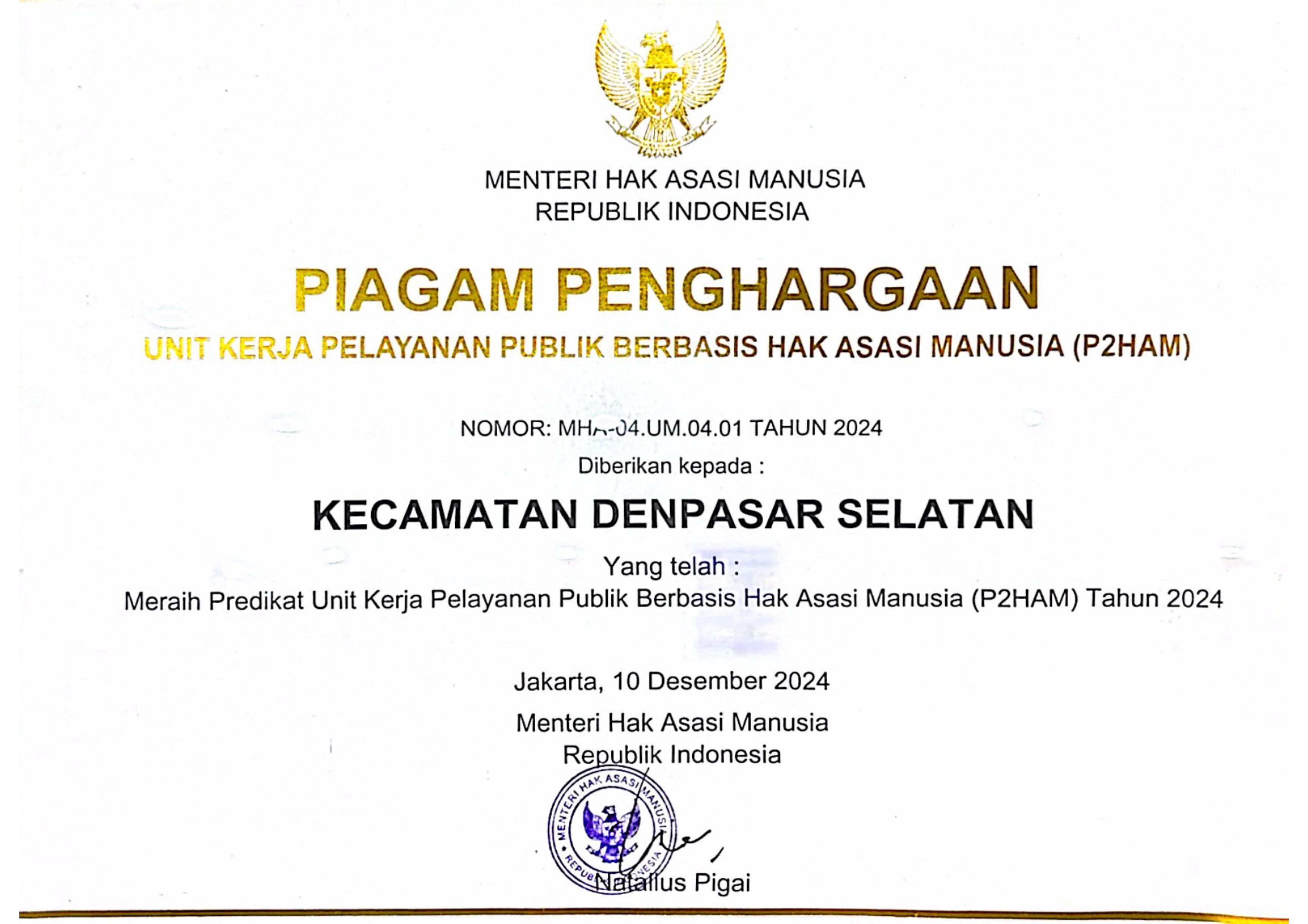 Dengan diraihnya Piagam P2HAM Tahun 2024, Kecamatan Denpasar Selatan penerima penghargaan menegaskan komitmennya dalam memberikan pelayanan yang menghormati martabat manusia, menjamin kesetaraan, dan memperhatikan kebutuhan seluruh lapisan masyarakat tanpa terkecuali.
