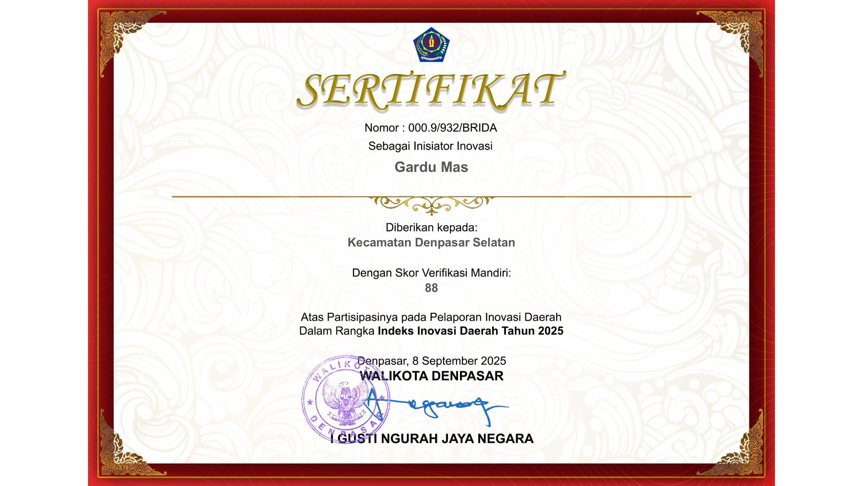 Sertifikat Sebagai Inisiator Inovasi GARDU MAS dalam rangka Pelaporan Inovasi Daerah Dalam Rangka Indeks Inovasi Daerah Tahun 2025