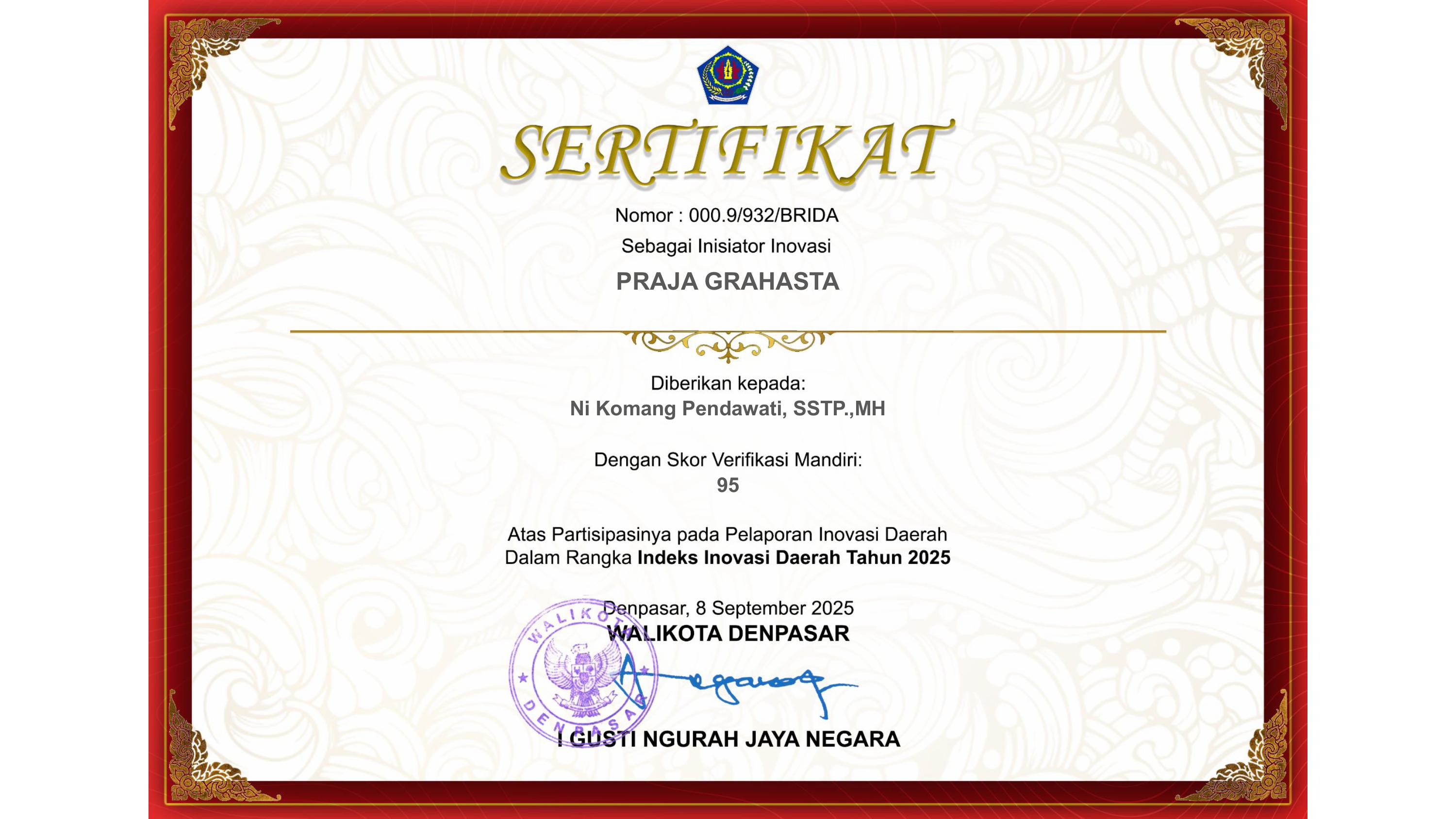 Sertifikat Sebagai Inisiator Inovasi PRAJA GRAHASTA